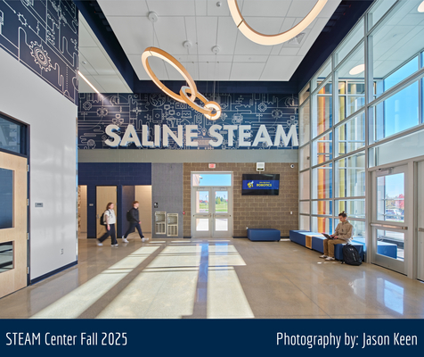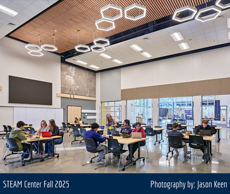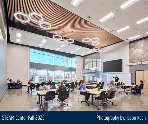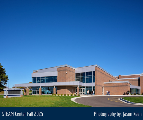- STEAM Center construction is underway on the front (south) side of the building, with a connection to the main gym. This space is designed to promote mixed-use across many departments, clubs, and groups at the High School, as well as be available for Community Education activities and rentals. The STEAM Center includes a flex space to host larger events with the ability to seat approximately 125 people, an open collaboration classroom outfitted with small group meeting rooms, a Robotics practice field, and dedicated workshop spaces.