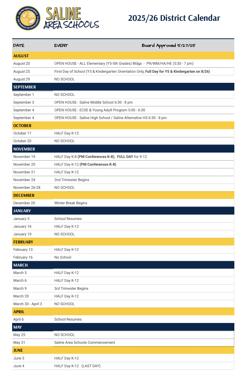 (Live Link) 2025/26 Saline Area Schools District Calendar
