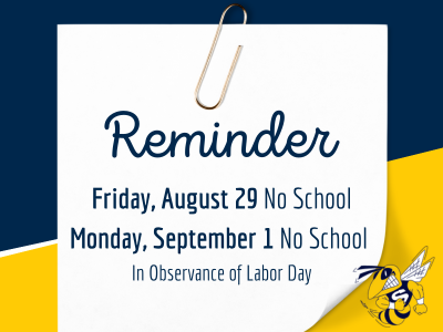 Friendly reminder for our Hornet families! There is no school Friday, August 29 and Monday, September 1. See you on Tuesday for a great start to week 2!