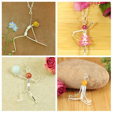 “Stick figure people are my favorite (jewelry) product line,” VIRGINIE ROLLAND relates as “I created and perfected the technique myself, using a combination of basic wire wrapping techniques.” “Each is a challenge as I create new poses and activities for ‘my little guys,’ ” she continues. As Virginie creates these special creations, she also enhances these pieces with natural stones and gemstones. She recently created “Michigan” or “Heart” shape pendants plus her figures doing several popular sports. All of this fuels her creative side, and she admits to an “ ‘ah-ah’ moment during meditation in a yoga class. “I knew I had to create yoga people doing yoga poses but also martial artists, ballerinas, runners, gymnasts and many others,” Virginie states. Customizing her work with school colors or adding sterling silver accents provides this creative individual totally enjoy this craft. Eventhough Michigan pendants are her #1 seller, she finds all of the creations a challenge that she pursues with a passion.